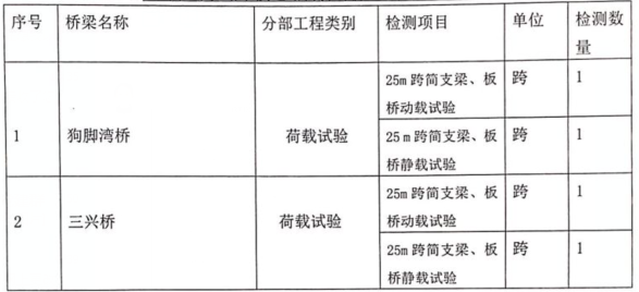 2.項(xiàng)目內(nèi)容:對(duì)碧峰峽路下段道路狗腳灣橋、三興橋進(jìn)行動(dòng)、靜荷載試驗(yàn)。