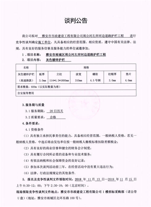 周公河左岸河邊道路護(hù)欄工程競(jìng)爭(zhēng)性談判公告(市政公司)