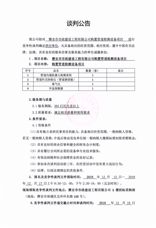 市政公司購置管道檢測設(shè)備項目的競爭性談判公告