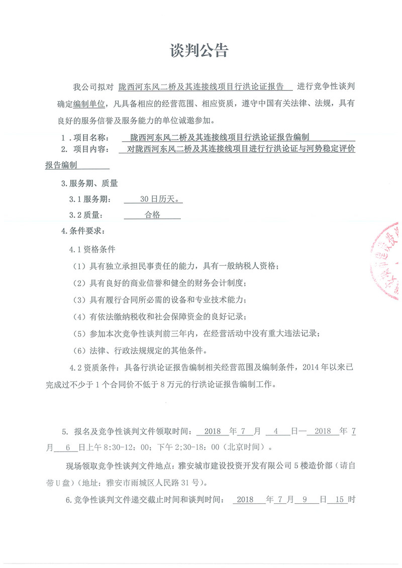隴西河?xùn)|風(fēng)二橋及其連接線(xiàn)項(xiàng)目行洪論證報(bào)告編制的競(jìng)爭(zhēng)性談判公告