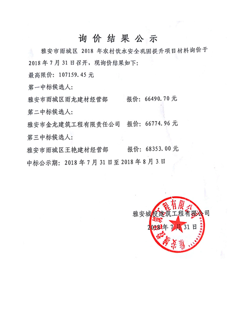 雅安市雨城區(qū)2018年農(nóng)村飲水安全鞏固提升項目材料詢價結(jié)果公示