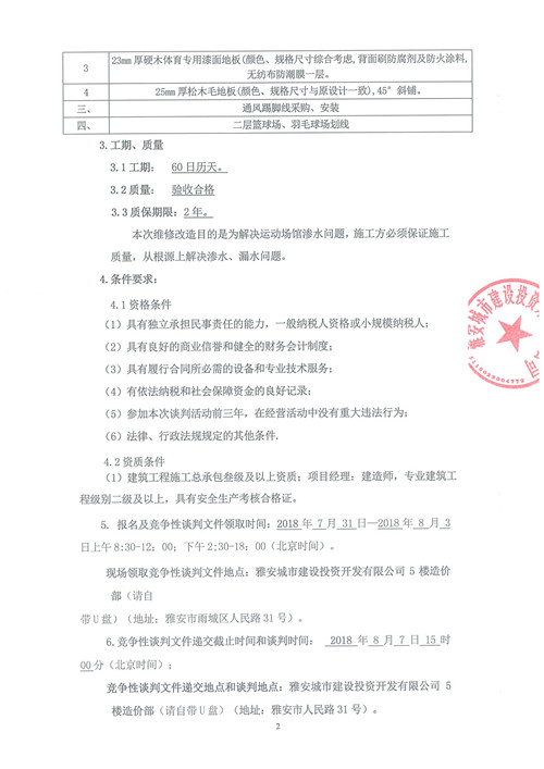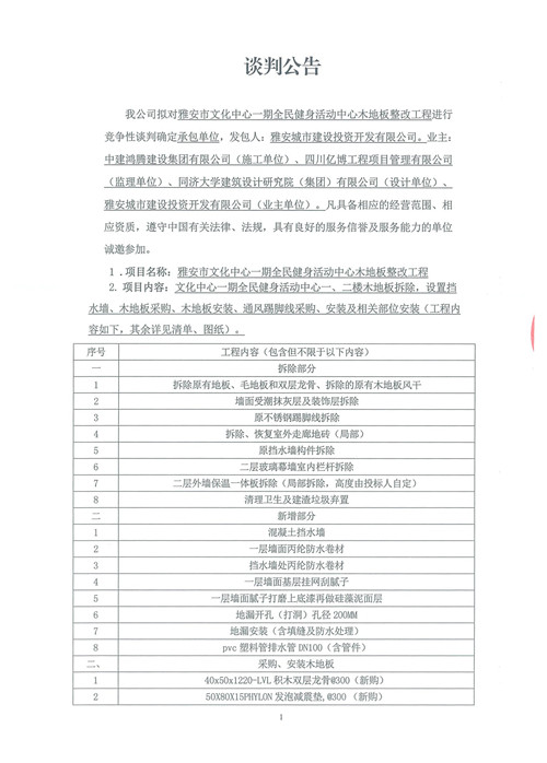 雅安市文化中心一期全民健身活動中心木地板整改工程——競爭性談判公告