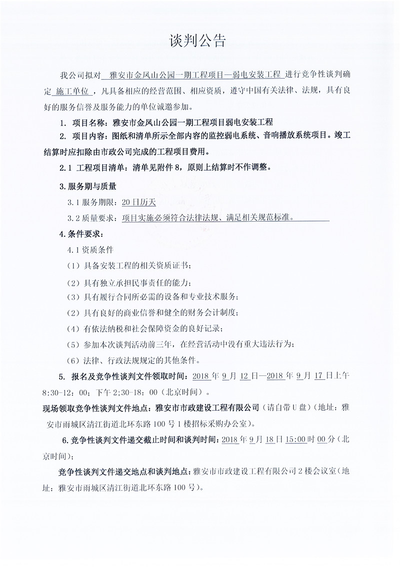 雅安市金鳳山公園一期工程項(xiàng)目——弱電安裝工程(競爭談判公告)