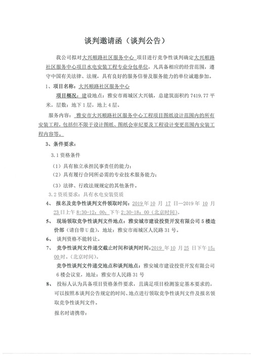 大興順路社區(qū)服務(wù)中心項目水電安裝工程專業(yè)分包單位競爭性談判公告