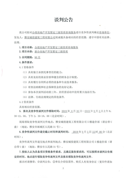 雅安城投建筑工程有限公司辦理房地產(chǎn)開發(fā)暫定三級(jí)資質(zhì)咨詢服務(wù)競(jìng)爭(zhēng)性談判公告