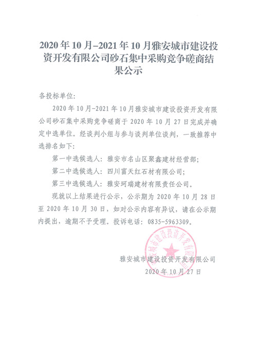 2020年10月-2021年10月雅安城市建設(shè)投資開發(fā)有限公司砂石集中采購競(jìng)爭磋商結(jié)果公示