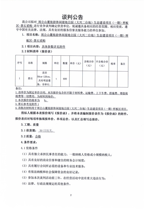 市政公司周公山麓旅游休閑濕地公園(大興二臺地)生態(tài)建設項目(一期)樣板區(qū)-景石采購競爭性談判