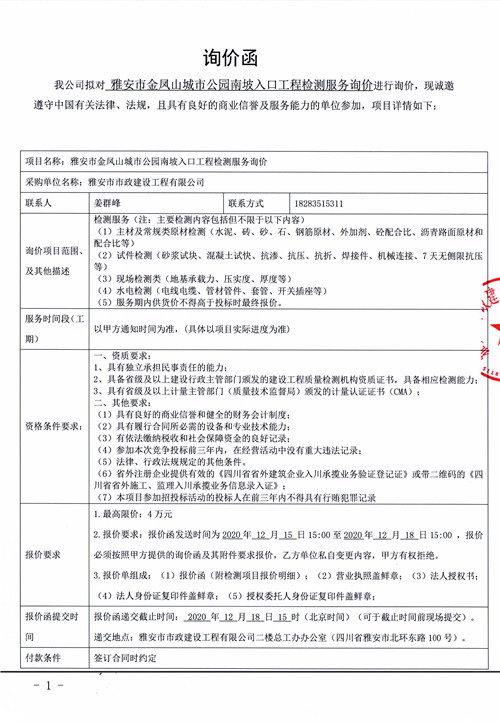 雅安市金鳳山城市公園南坡入口工程檢測(cè)服務(wù)詢價(jià)函