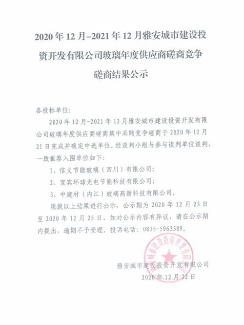 2020年12月-2021年12月雅安城市建設(shè)投資開發(fā)有限公司玻璃年度供應(yīng)商磋商競爭磋商結(jié)果公示
