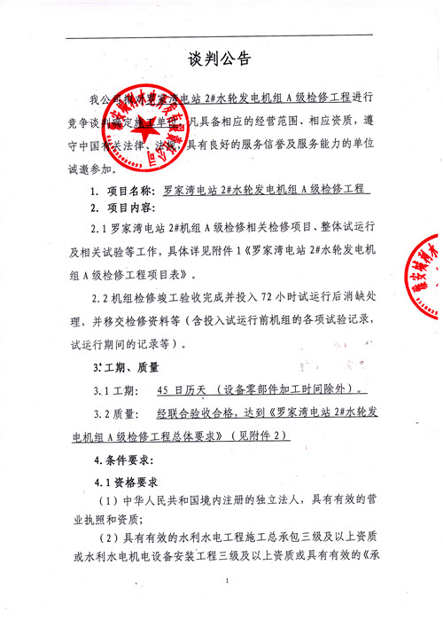 羅家灣電站2#水輪發(fā)電機(jī)組A級檢修工程談判公告