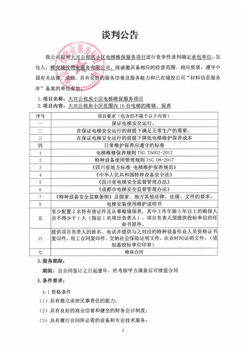 城投物業(yè)公司大興公租房小區(qū)電梯維保服務項目競爭性談判公告(第二次)