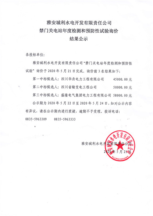 城利水電公司禁門關(guān)電站年度檢測和預(yù)防性試驗詢價結(jié)果公示