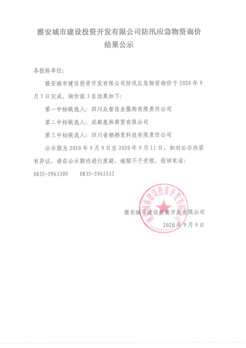 雅安城市建設(shè)投資開發(fā)有限公司防汛應(yīng)急物資詢價(jià)結(jié)果公示