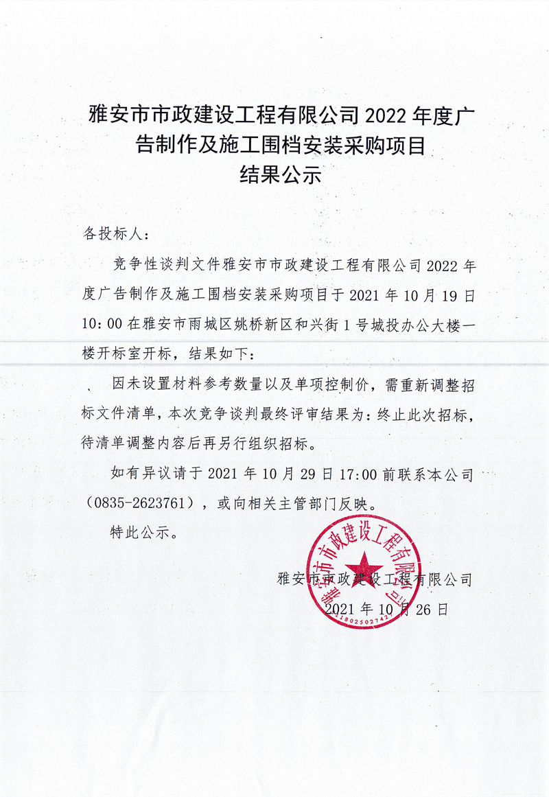 雅安市市政建設(shè)工程有限公司2022年度廣告制作及施工圍檔安裝采購項目競爭性談判結(jié)果公示