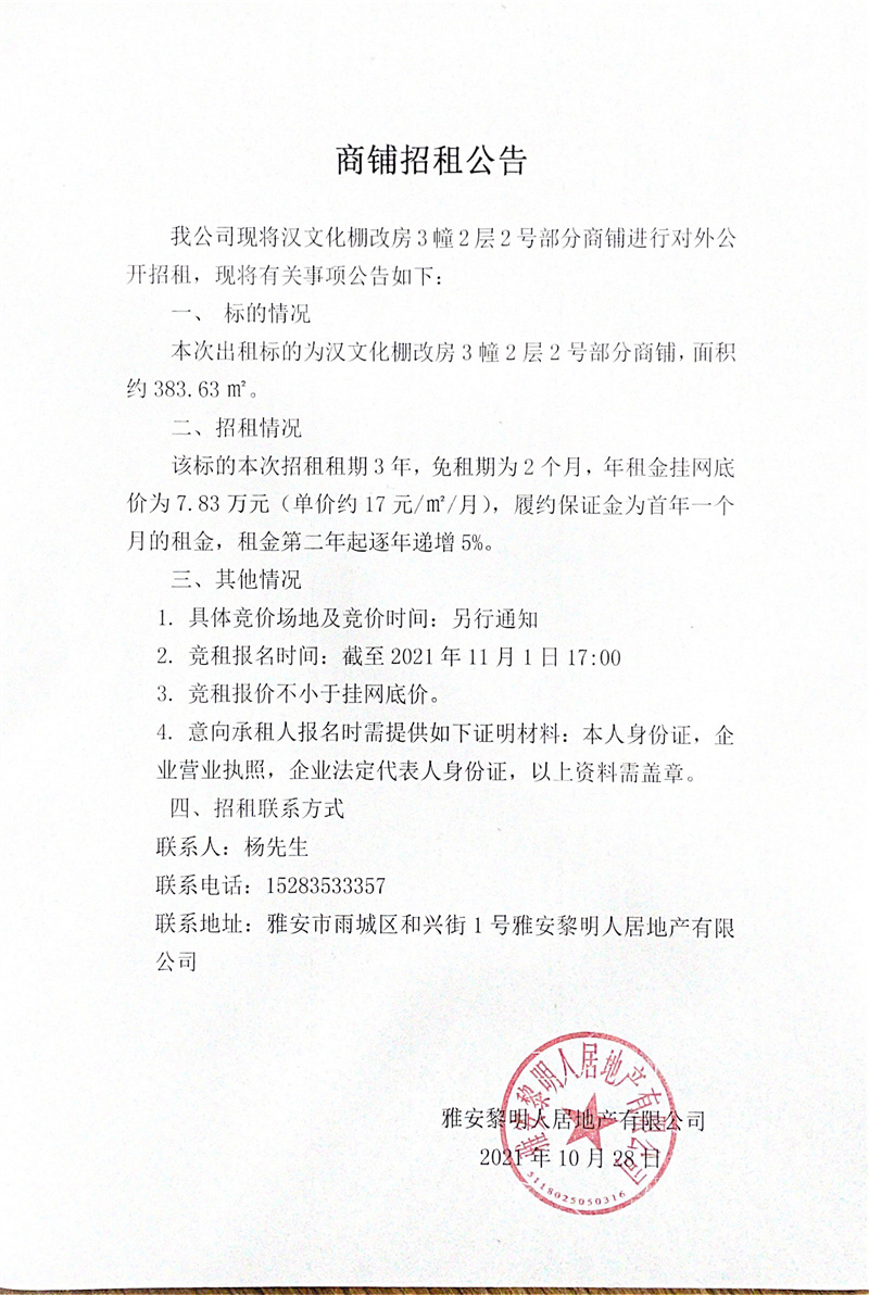 漢文化棚改房3幢2層2號(hào)商鋪對(duì)外招租公告