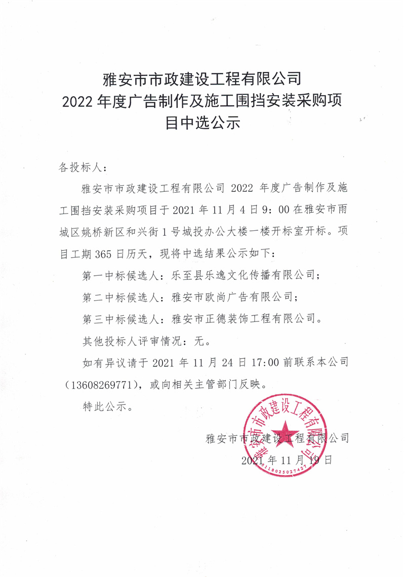 雅安市市政建設(shè)工程有限公司2022年度廣告制作及施工圍擋安裝采購項目中選公示