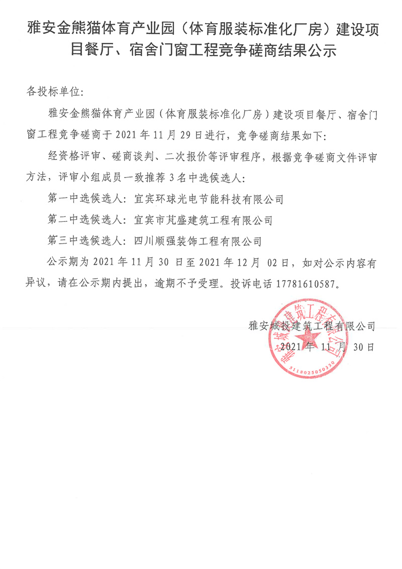 雅安金熊貓體育產(chǎn)業(yè)園(體育服裝標準化廠房)建設(shè)項目餐廳、宿舍門窗工程競爭磋商結(jié)果公示