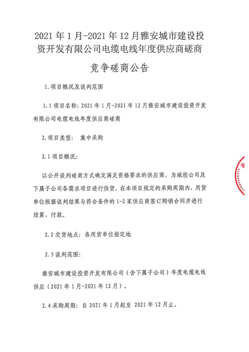 2021年1月-2021年12月雅安城市建設(shè)投資開發(fā)有限公司電纜電線年度供應(yīng)商磋商競爭磋商公告