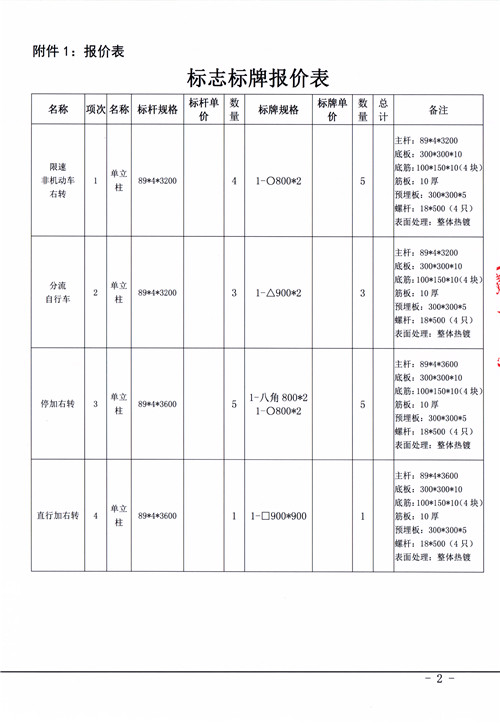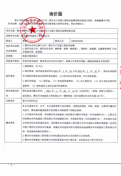 雅安市市政建設工程有限公司雅安市光華山路與大興二橋交叉口交通工程標識標牌采購安裝詢價函