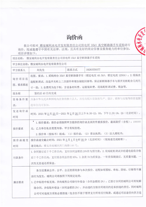 城利水電公司供電所35kV真空斷路器手車采購詢價函