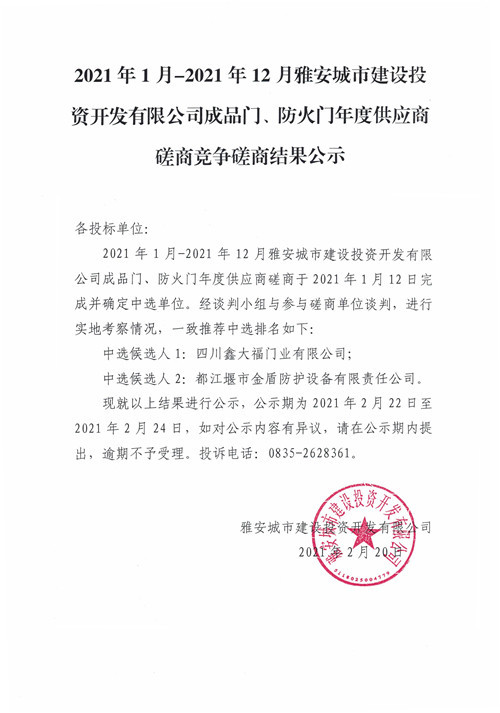 2021年1月-2021年12月雅安城市建設(shè)投資開發(fā)有限公司成品門、防火門年度供應(yīng)商磋商競爭磋商結(jié)果公示