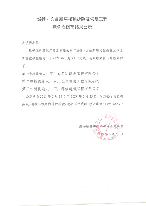 城投·文曲新座樓頂拆除及恢復(fù)工程競(jìng)爭(zhēng)性磋商結(jié)果公示