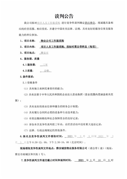 城投物業(yè)公司項(xiàng)目人員工作服采購競爭性談判公告