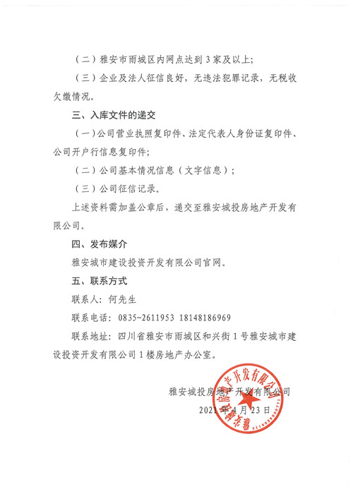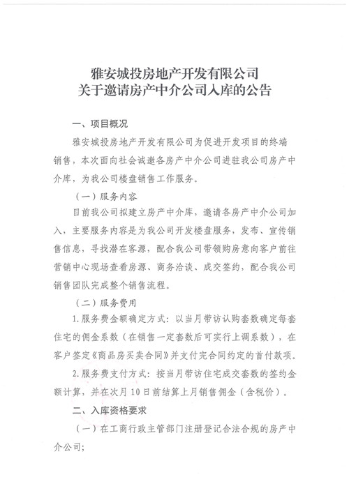 雅安城投房地產(chǎn)開發(fā)有限公司關(guān)于邀請(qǐng)房地產(chǎn)中介公司入庫(kù)的公告