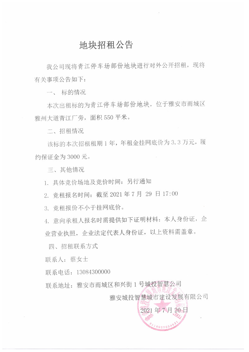 城投智慧公司青江停車(chē)場(chǎng)部分地塊招租公告(550㎡)