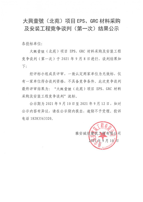 大興壹號(北苑)項目EPS、GRC材料采購及安裝工程競爭談判結果公示