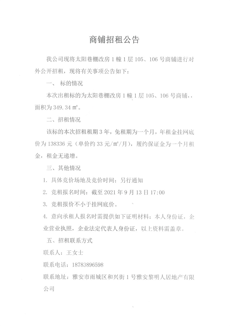黎明人居公司太陽(yáng)巷棚改房1幢1層105、106號(hào)商鋪招租公告