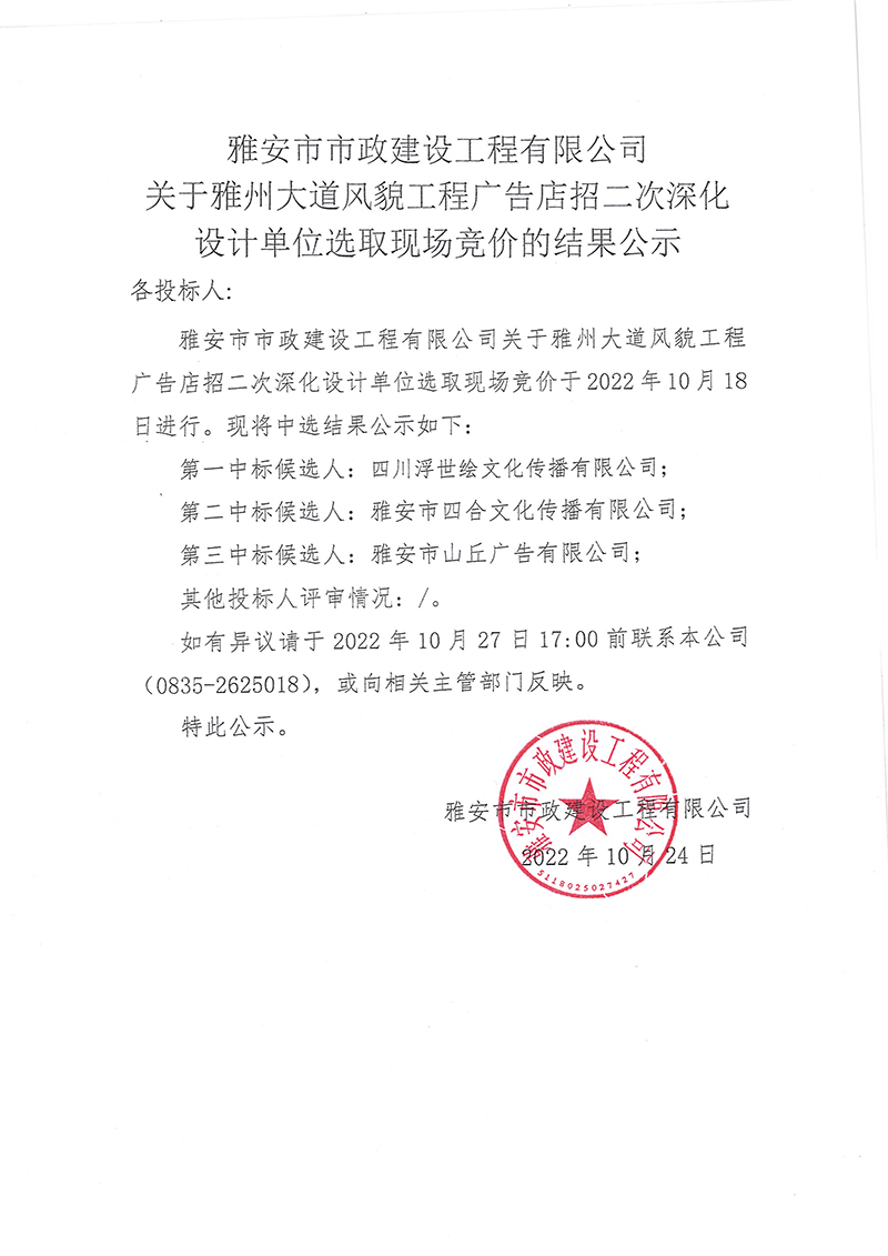雅安市市政建設(shè)工程有限公司關(guān)于雅州大道風(fēng)貌工程廣告店招二次深化設(shè)計(jì)單位選取現(xiàn)場競價(jià)的結(jié)果公示