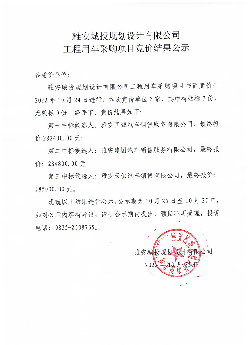 雅安城投規(guī)劃設(shè)計有限公司工程用車采購項目競價結(jié)果公示