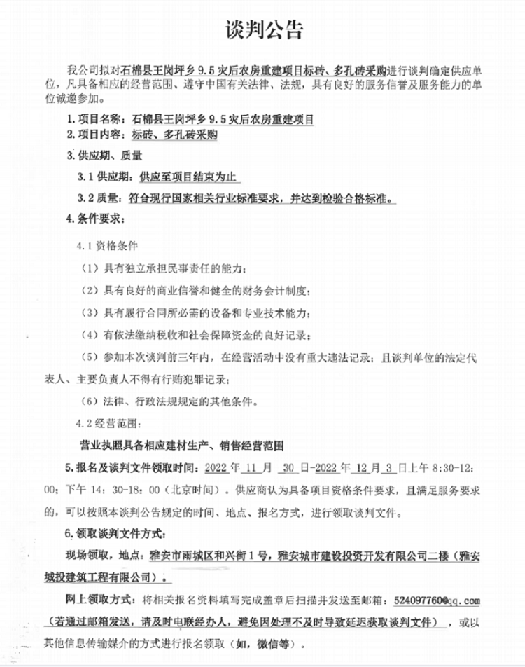 石棉縣王崗坪鄉(xiāng)9.5災(zāi)后農(nóng)房重建項(xiàng)目標(biāo)磚、多孔磚采購(gòu)談判公告