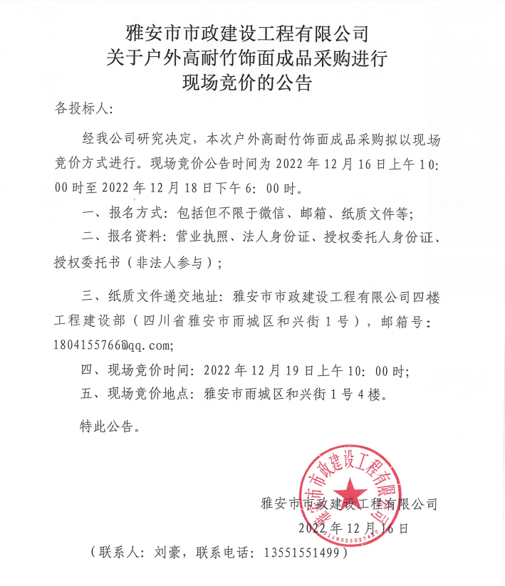 雅安市市政建設(shè)工程有限公司關(guān)于戶外高耐竹飾面成品采購進(jìn)行現(xiàn)場(chǎng)競價(jià)公告