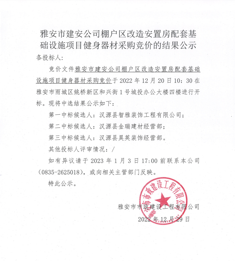 雅安市建安公司棚戶(hù)區(qū)改造安置房配套基礎(chǔ)設(shè)施項(xiàng)目健身器材采購(gòu)競(jìng)價(jià)結(jié)果公示