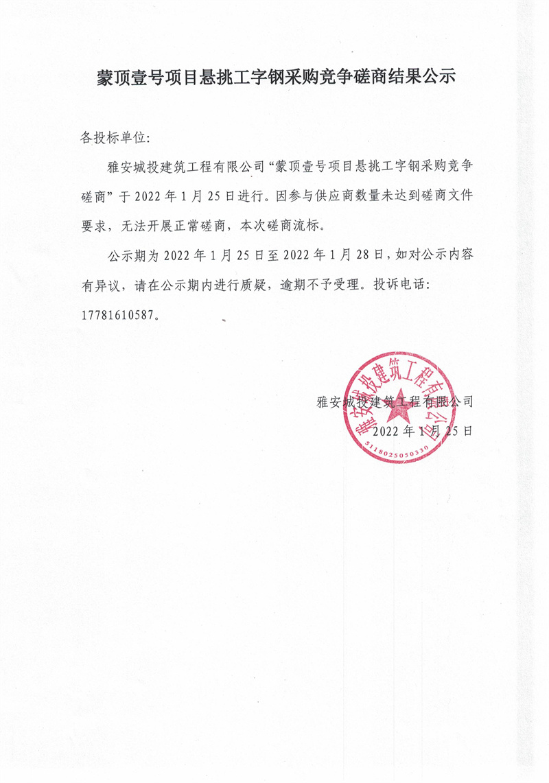 蒙頂壹號項(xiàng)目懸挑工字鋼采購競爭磋商結(jié)果公示
