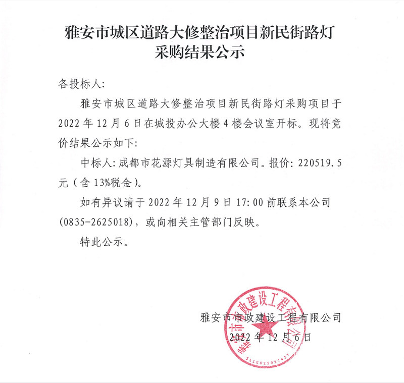 雅安市城區(qū)道路大修整治項(xiàng)目新民街路燈采購(gòu)結(jié)果公示