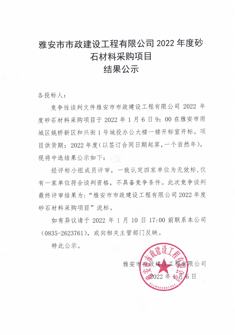 雅安市市政建設(shè)工程有限公司2022年度砂石材料采購項目結(jié)果公示