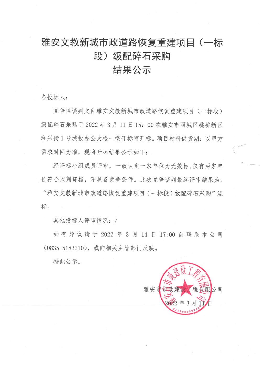 雅安文教新城市政道路恢復(fù)重建項目(一標段)級配碎石采購結(jié)果公示