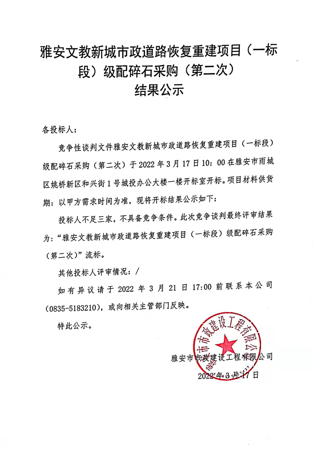 雅安文教新城市政道路恢復重建項目(一標段)級配碎石采購(第二次)結(jié)果公示