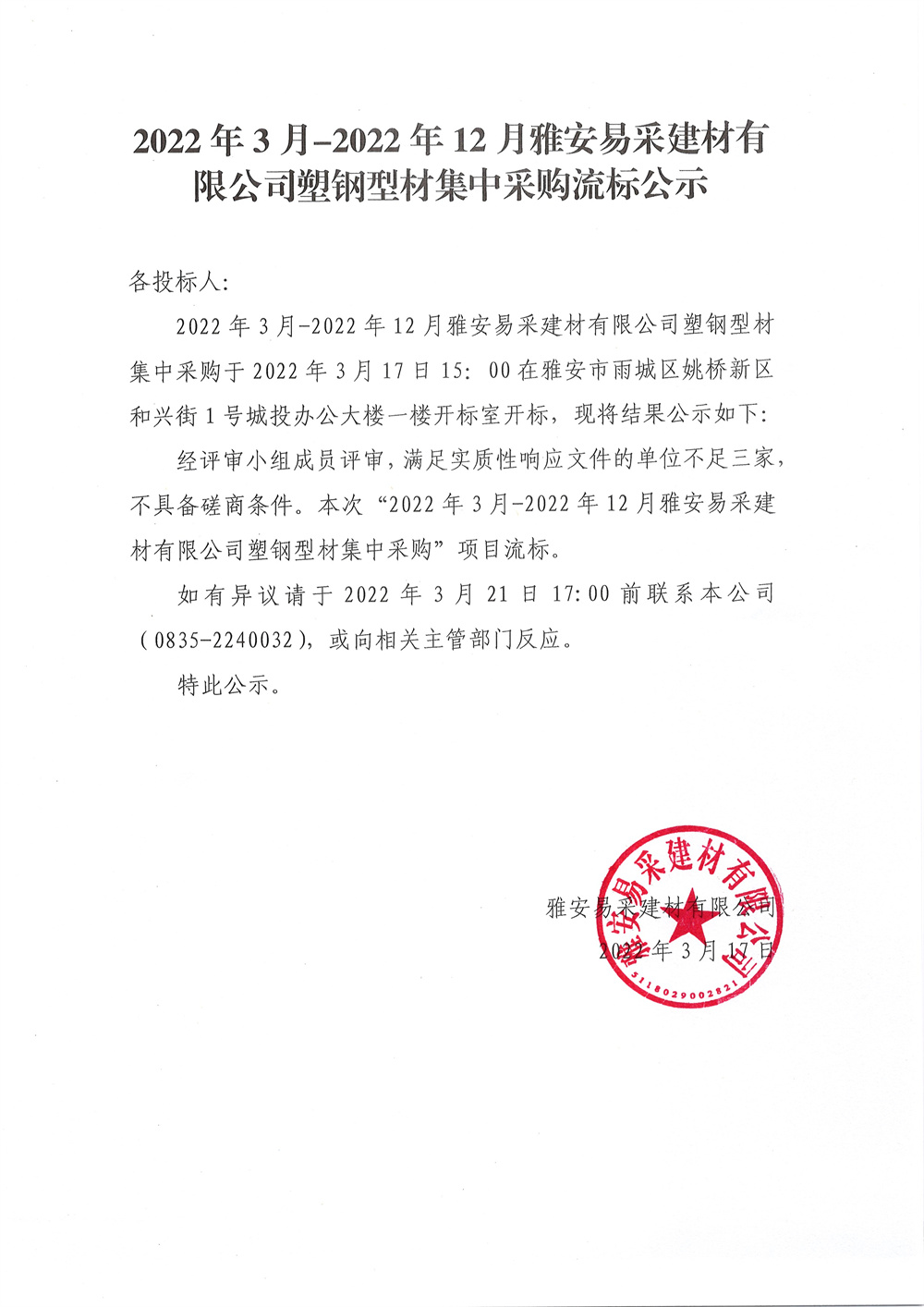 2022年3月-2022年12月雅安易采建材有限公司塑鋼型材集中采購流標公示