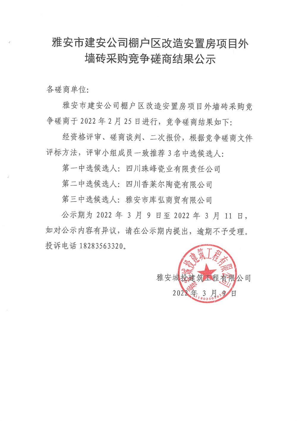 雅安市建安公司棚戶(hù)區(qū)改造安置房項(xiàng)目外墻磚采購(gòu)競(jìng)爭(zhēng)磋商結(jié)果公示