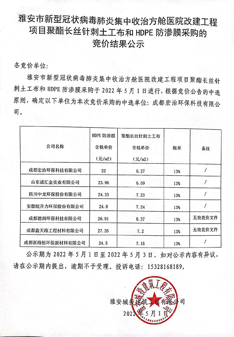 關于雅安市新型冠狀病毒肺炎集中收治方艙醫(yī)院改建工程項目聚酯長絲針刺土工布和HDPE防滲膜采購的競價結果公示