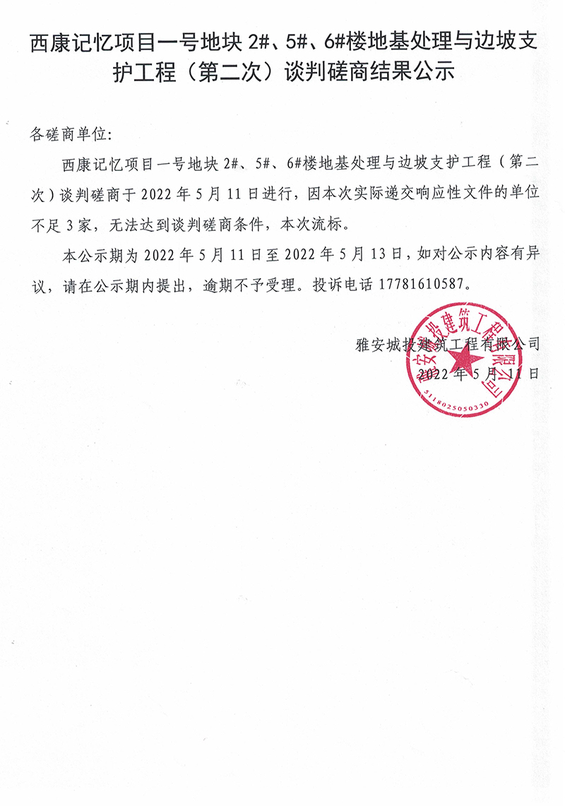 西康記憶項目一號地塊2#、5#、6#樓地基處理與邊坡支護(hù)工程(第二次)談判磋商結(jié)果公示