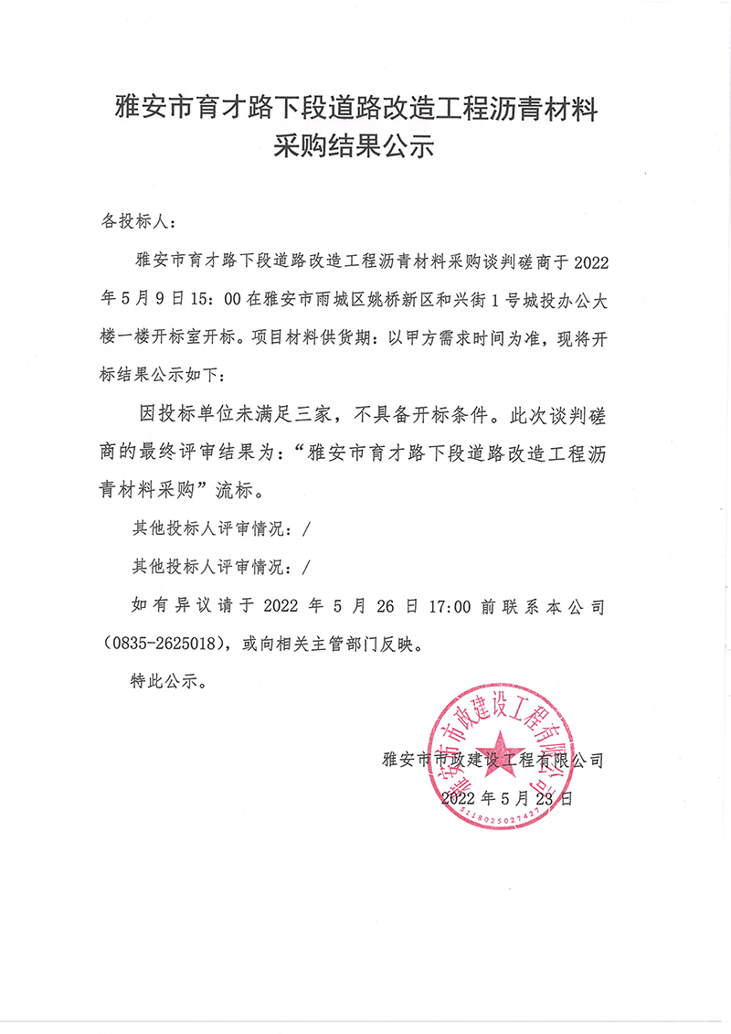 雅安市育才路下段道路改造工程瀝青材料采購結(jié)果公示