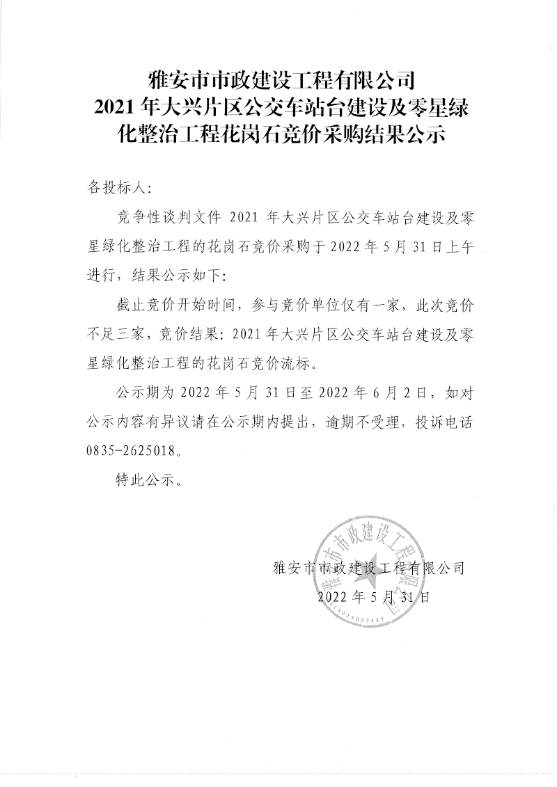 雅安市2021年大興片區(qū)公交車站臺建設(shè)及零星綠化整治工程項目花崗石材料競價采購結(jié)果公示