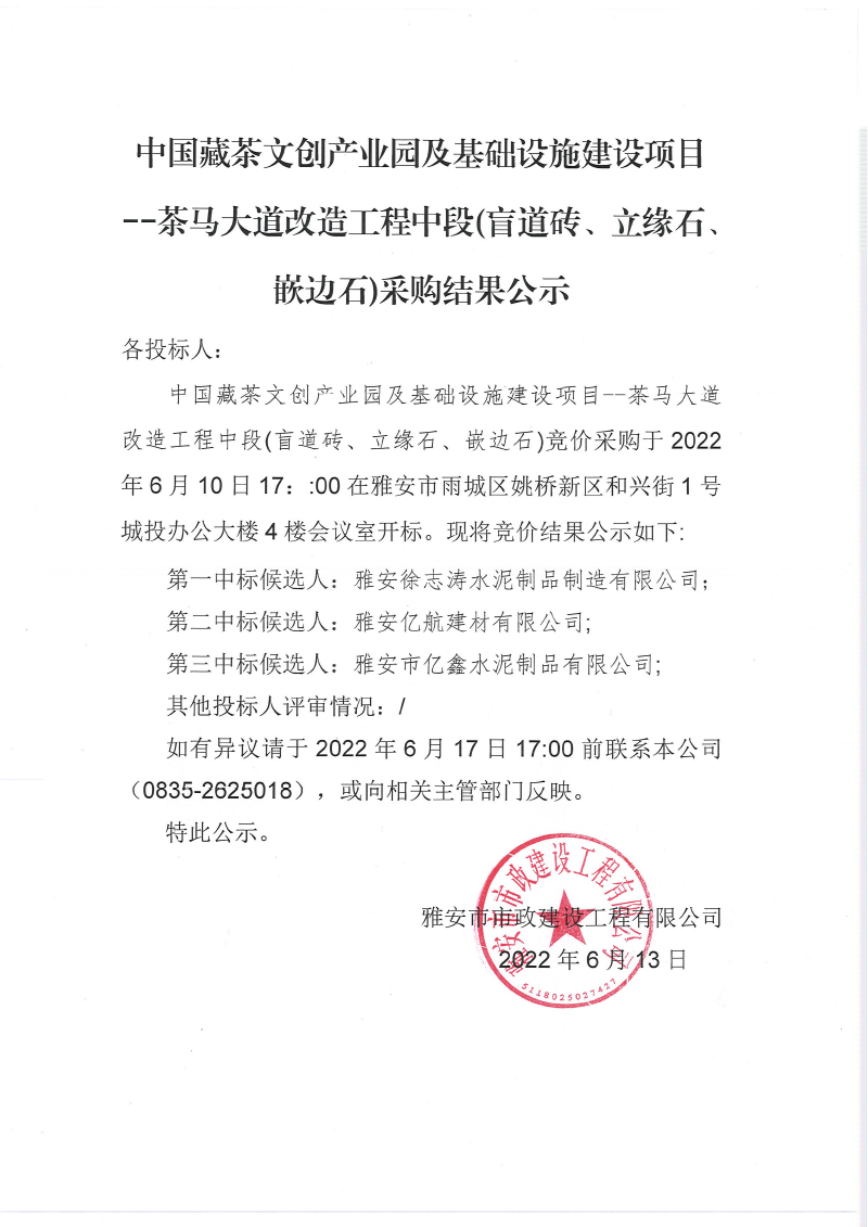 中國藏茶文創(chuàng)產(chǎn)業(yè)園及基礎(chǔ)設(shè)施建設(shè)項 茶馬大道改造工程中段盲道磚、混凝土嵌邊石采購結(jié)果公示