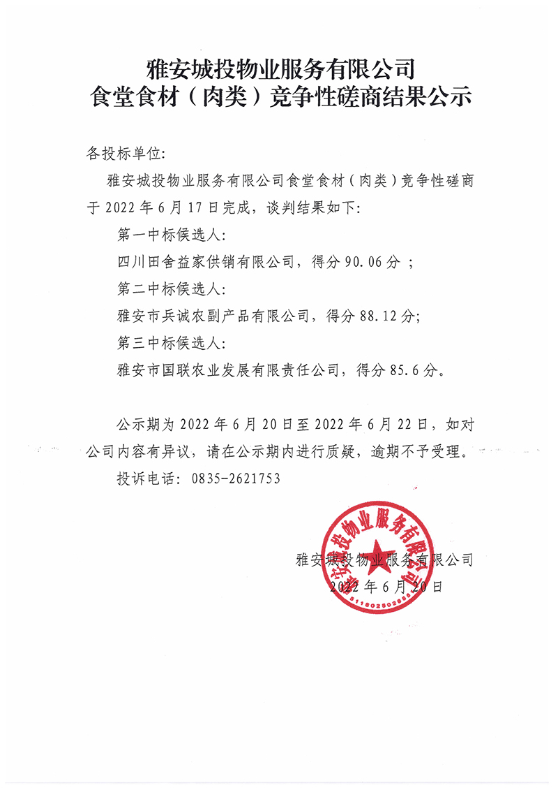 城投公司食堂食材(肉類)采購項(xiàng)目競爭性磋商結(jié)果公示