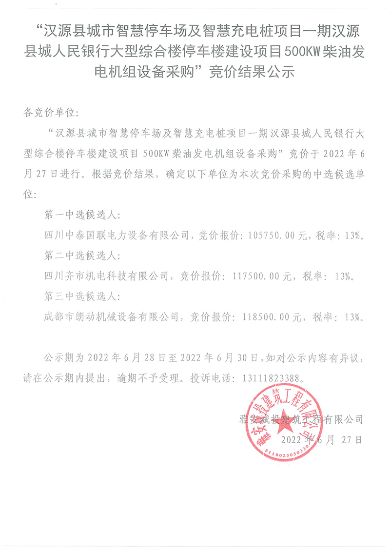 漢源縣城市智慧停車場(chǎng)及智慧充電樁項(xiàng)目一期漢源縣城人民銀行大型綜合樓停車樓建設(shè)項(xiàng)目500kw柴油發(fā)電機(jī)組設(shè)備采購(gòu)競(jìng)價(jià)結(jié)果公告